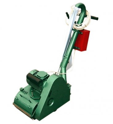 Привод шлифовального барабана осуществляется от электродвигателя через клиноременную передачу. Натяжение клинового ремня производится смещением поворотной плиты двигателя. Боковые колеса ходового устройства имеют полиуретановое покрытие, что предотвращает повреждение пола при перемещении машины. Эксцентриковые оси боковых колес обеспечивают удобную и быструю регулировку положения шлифовального барабана относительно обрабатываемой поверхности. В машине предусмотрен механизм для регулирования усилия нажатия на поверхность пола, а также устройство для регулировки расстояния машины до стены помещения. Конструкция машин позволяет при снятых плинтусах обработать поверхность пола вблизи стен.